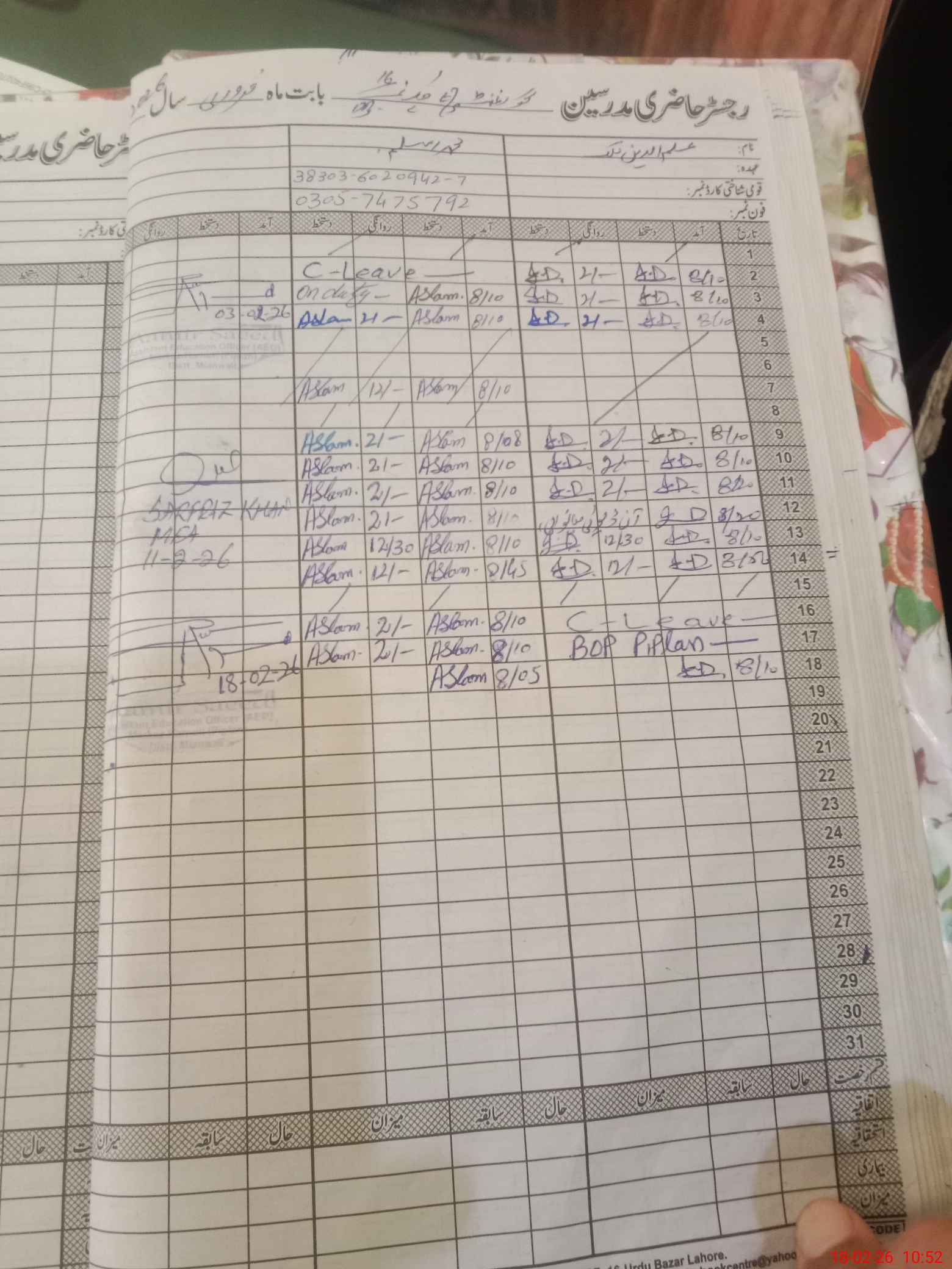 | CNIC | Full Name | Designation | R/C | Absence During Last Calender Month |