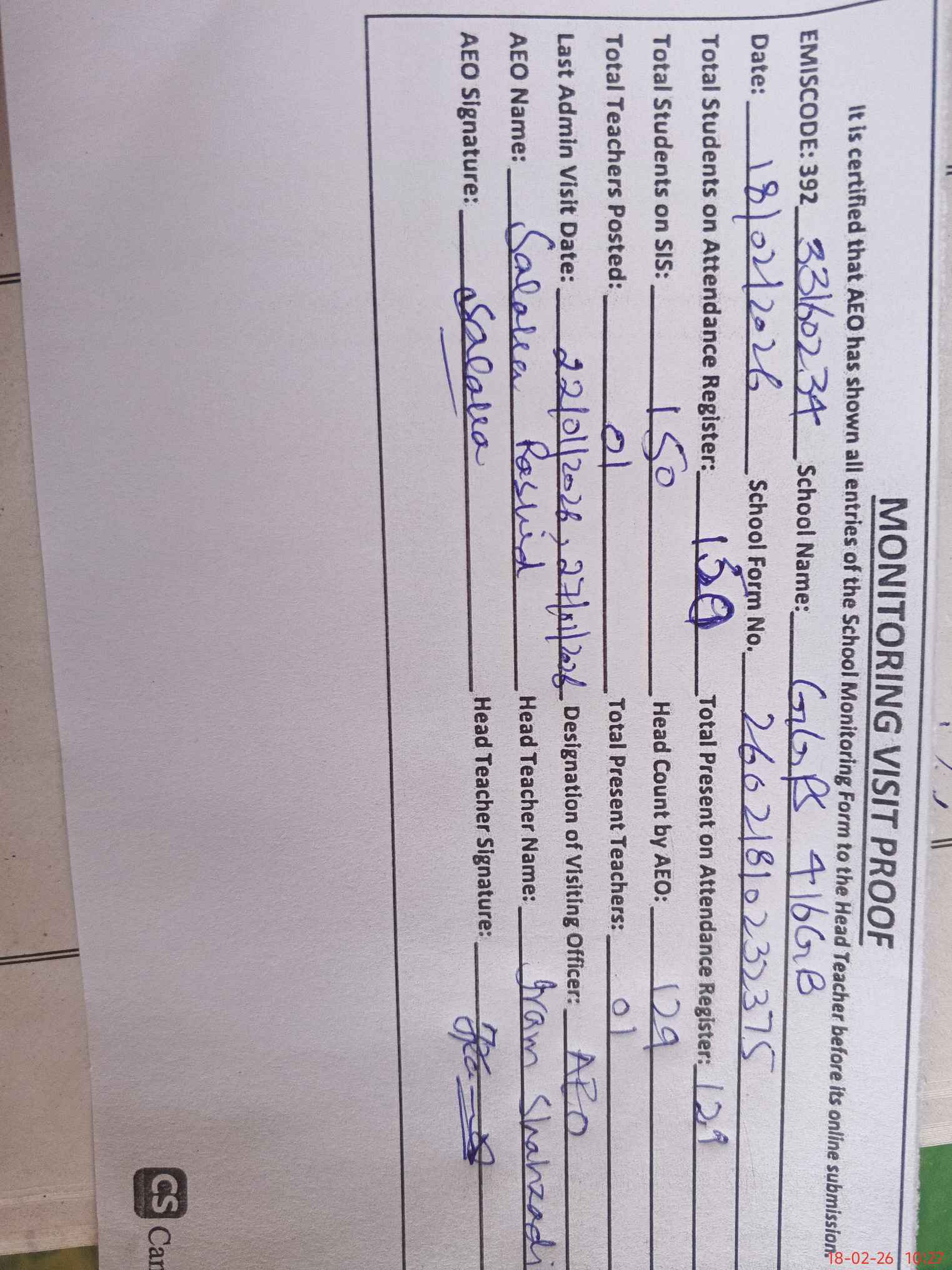 | Attendance Register | Head Teacher | MEA with School | Visit Proof |