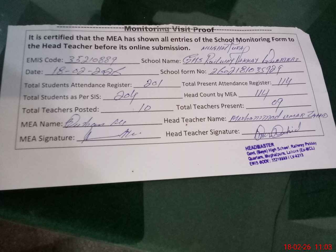 | EMIS Code: 35210889 | Name of School: GHS RAILWAY PAKKAY QUARTERS MUGHAL PURA (EX-MCL) | |||