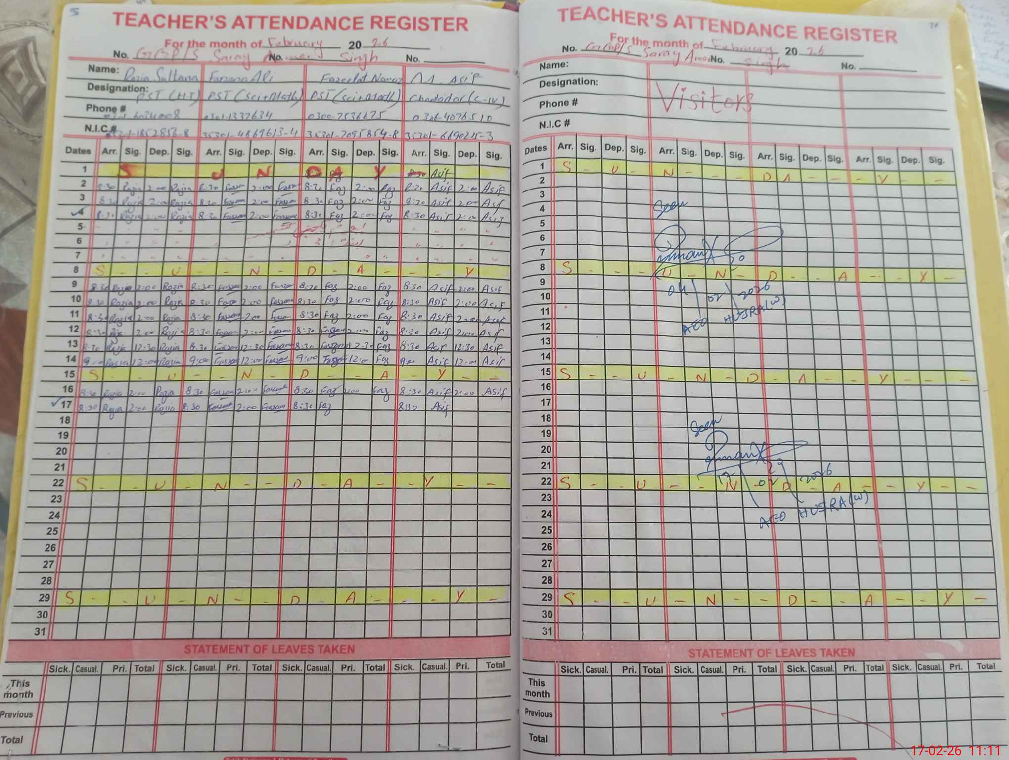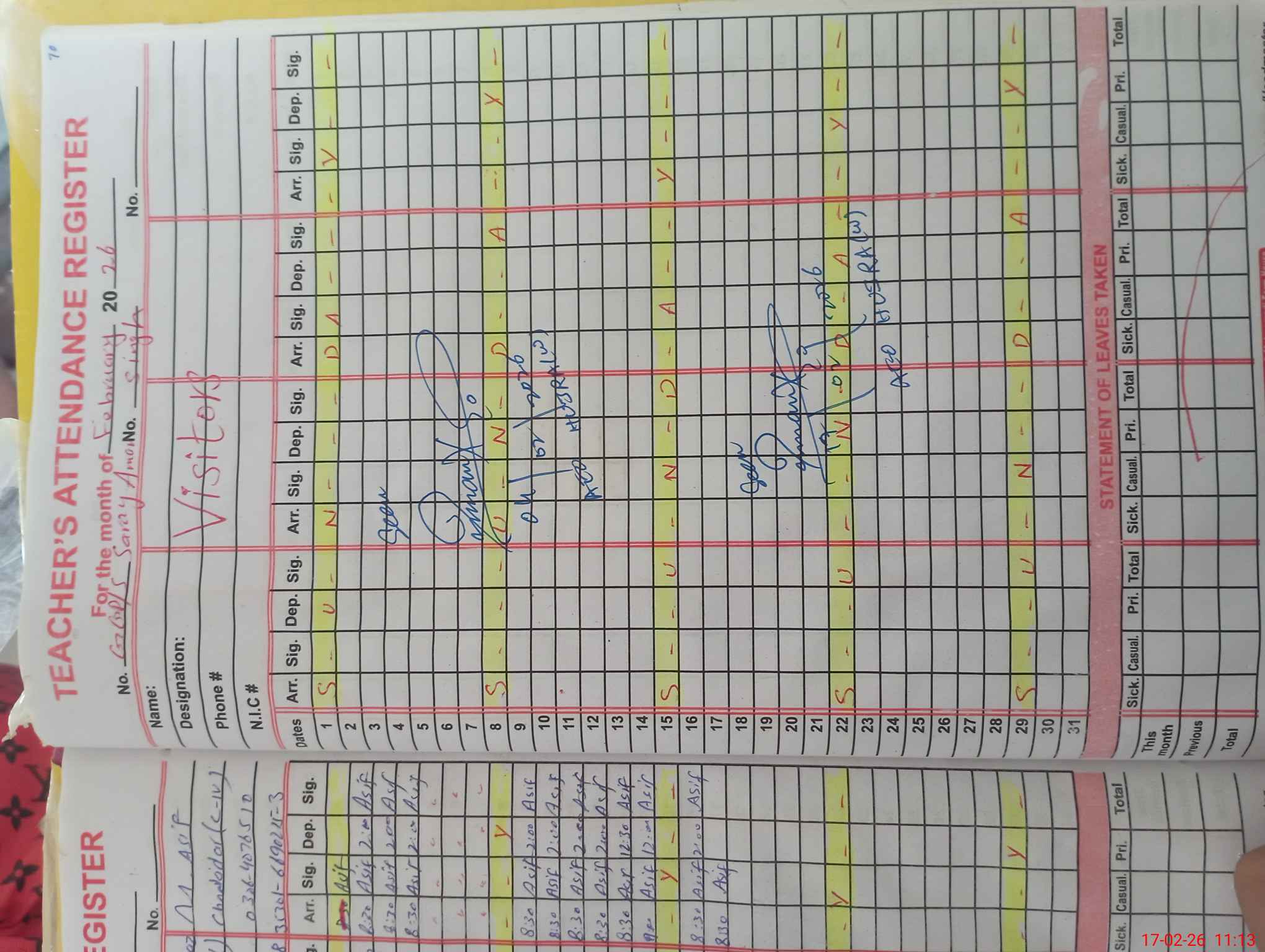 | CNIC | Full Name | Designation | R/C | Absence During Last Calender Month |