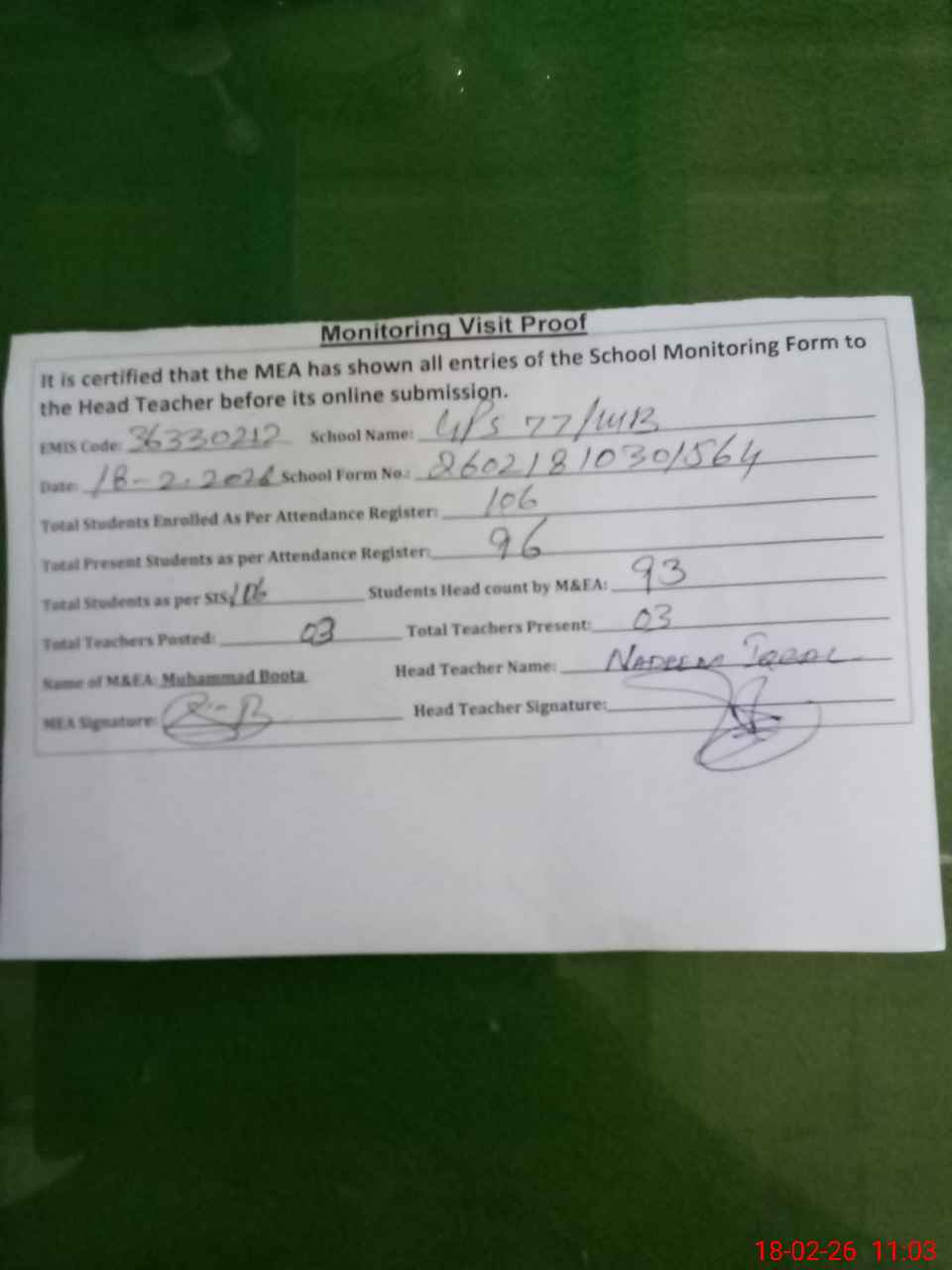 | EMIS Code: 36330212 | Name of School: GPS CHAK NO. 77/WB | |||