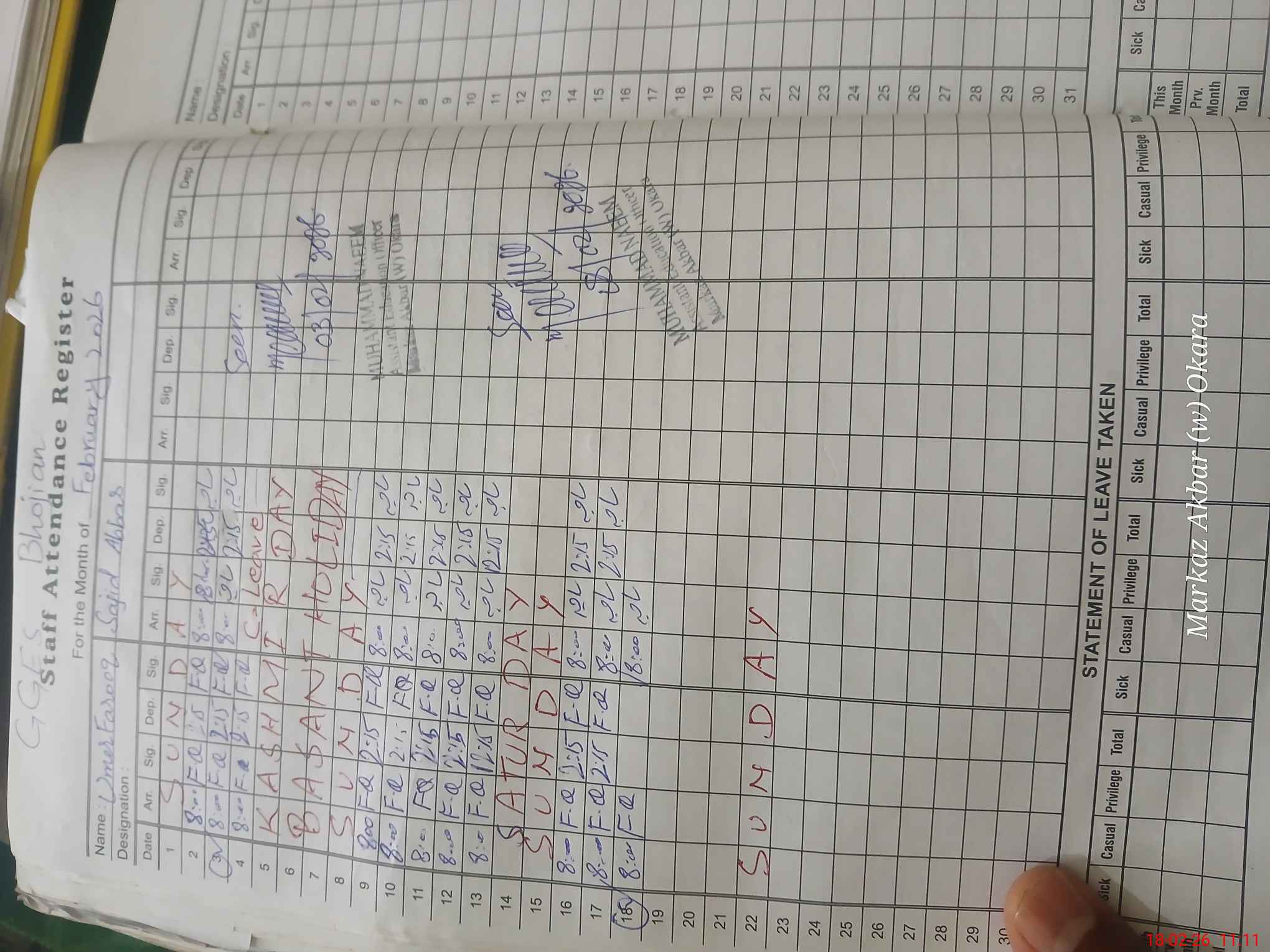 | CNIC | Full Name | Designation | R/C | Absence During Last Calender Month |