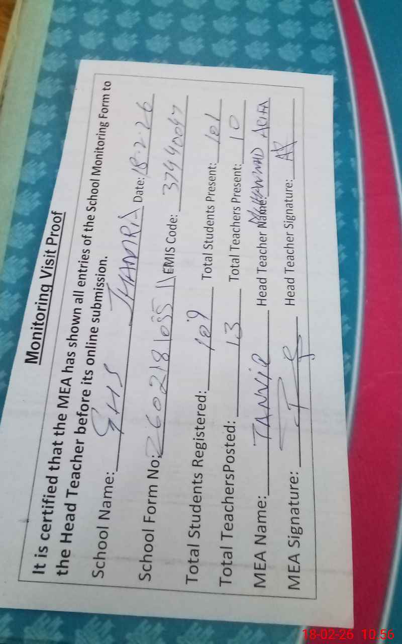 | Attendance Register | Head Teacher | MEA with School | Visit Proof |