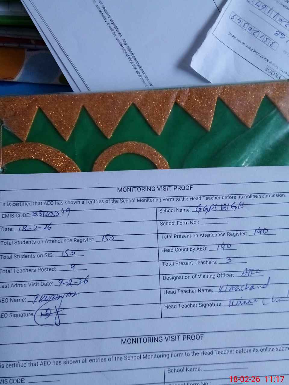 | Attendance Register | Head Teacher | MEA with School | Visit Proof |