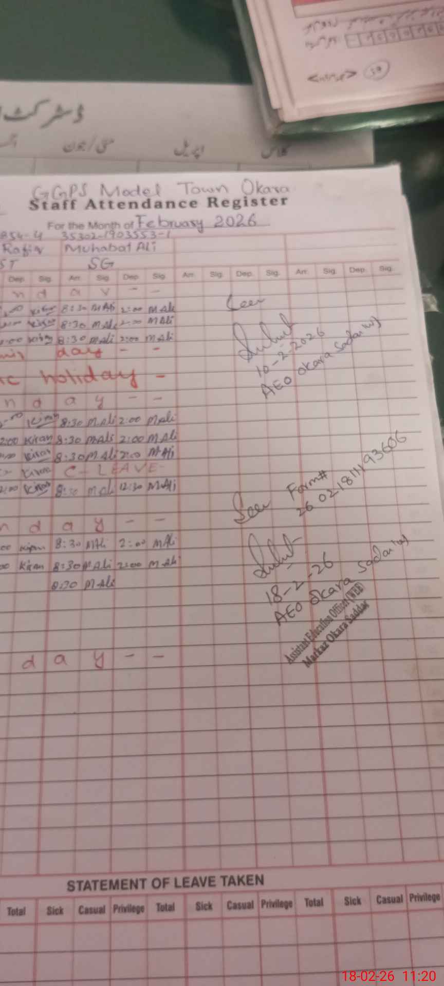| CNIC | Full Name | Designation | R/C | Absence During Last Calender Month |