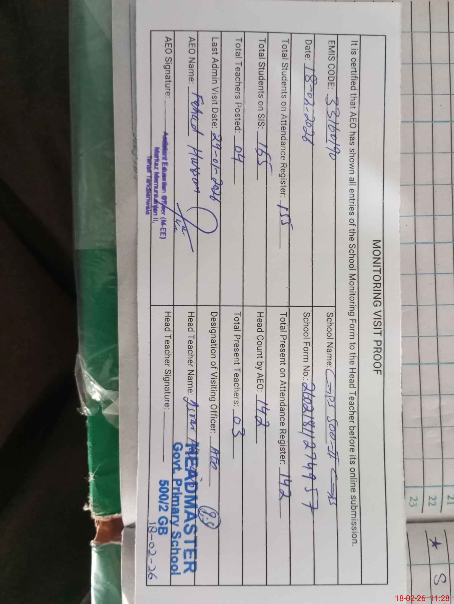 | Attendance Register | Head Teacher | MEA with School | Visit Proof |