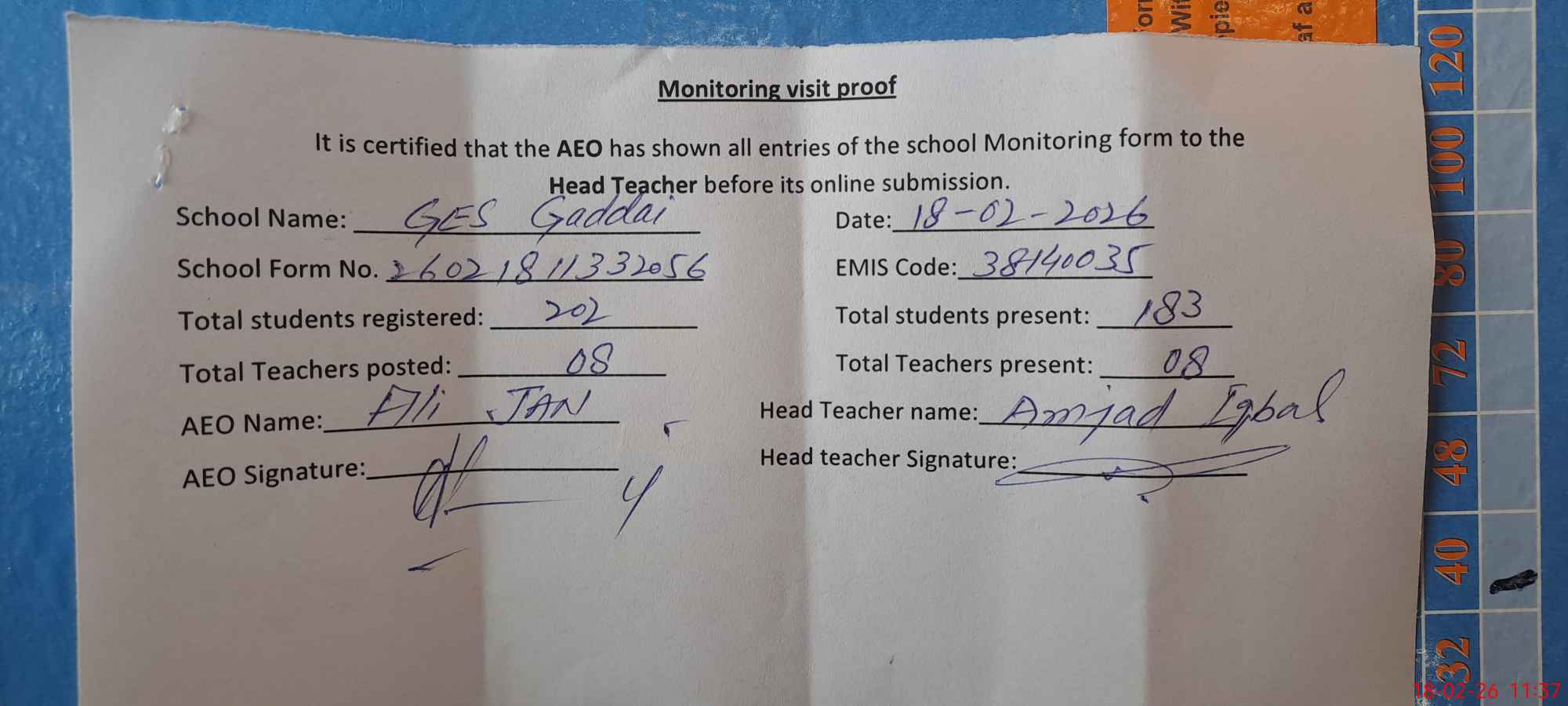 | Attendance Register | Head Teacher | MEA with School | Visit Proof |