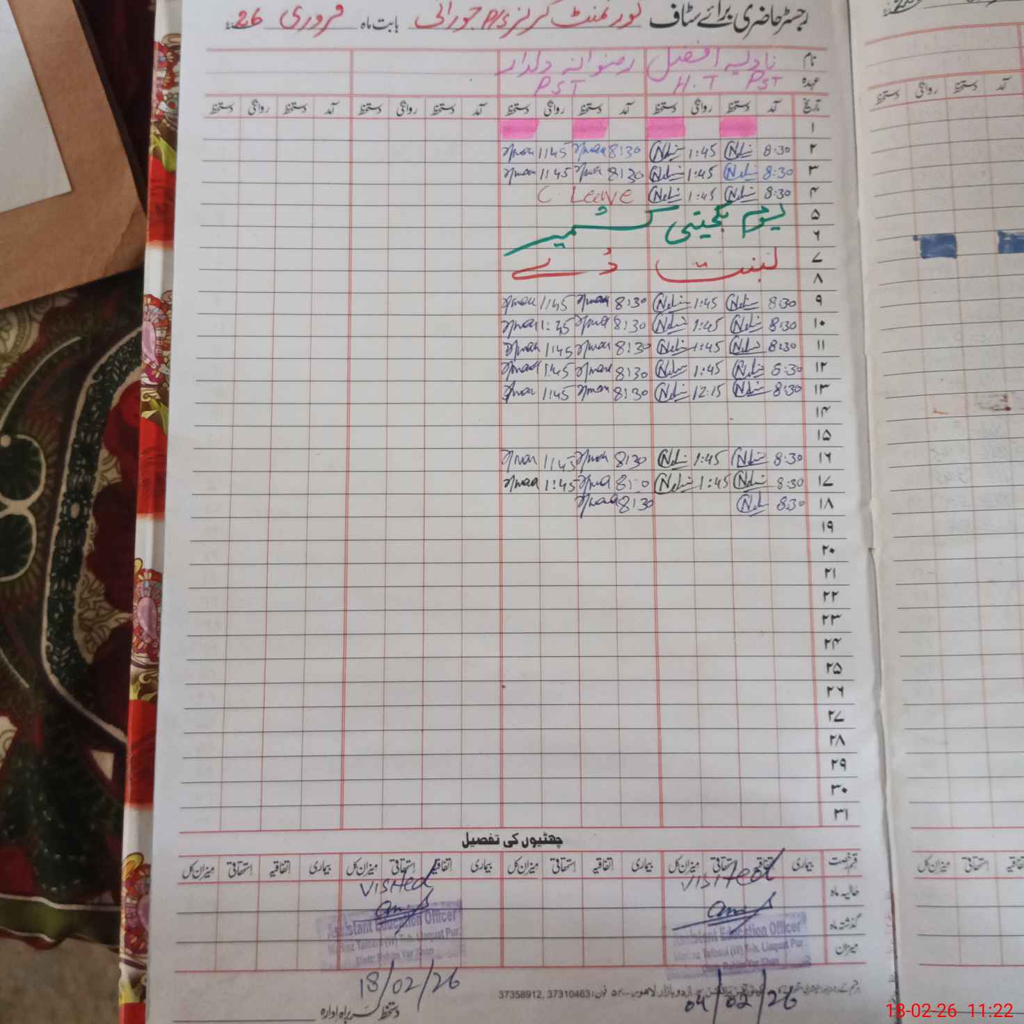 | CNIC | Full Name | Designation | R/C | Absence During Last Calender Month |