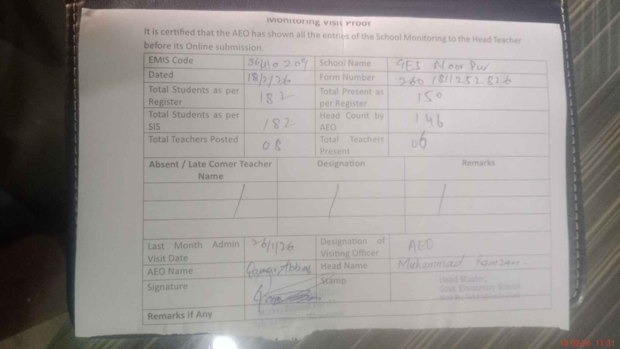 | EMIS Code: 36410209 | Name of School: GES NOOR PUR, KABIRWALA | |||