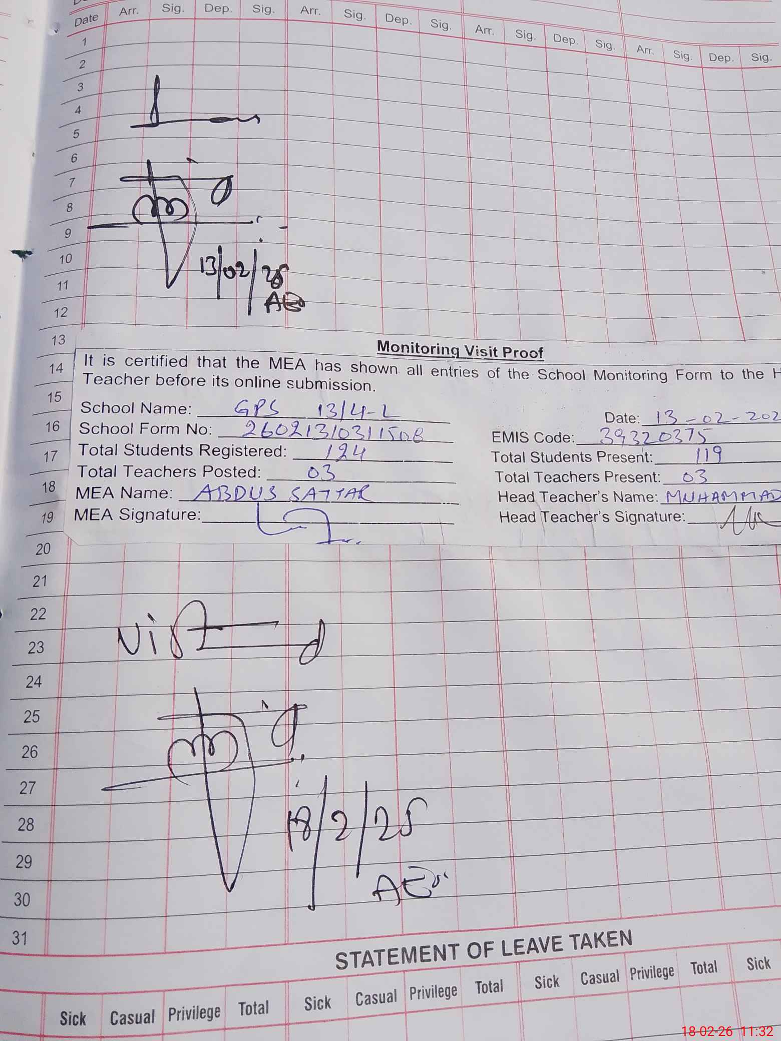 | Attendance Register | Head Teacher | MEA with School | Visit Proof |