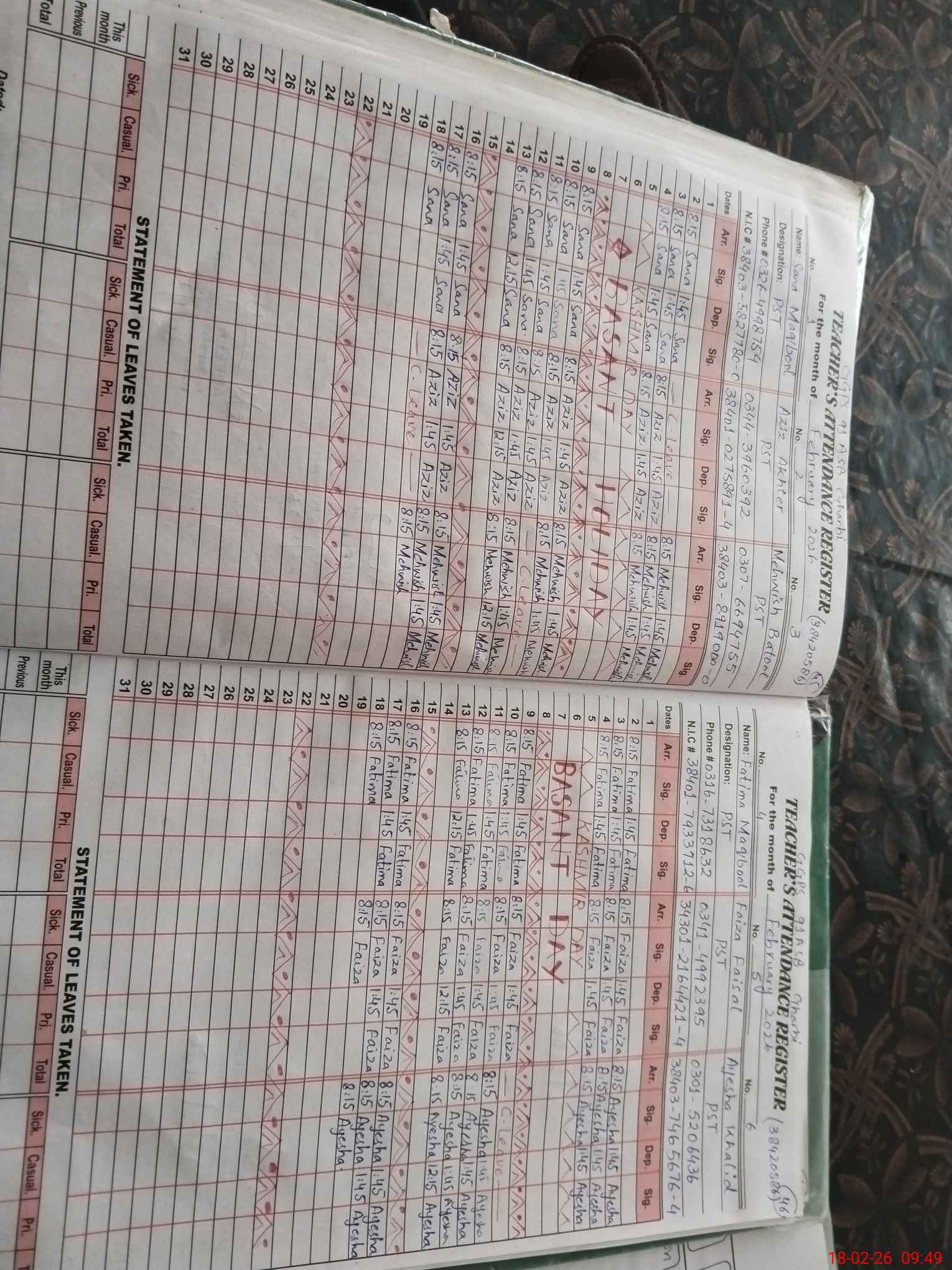 | CNIC | Full Name | Designation | R/C | Absence During Last Calender Month |