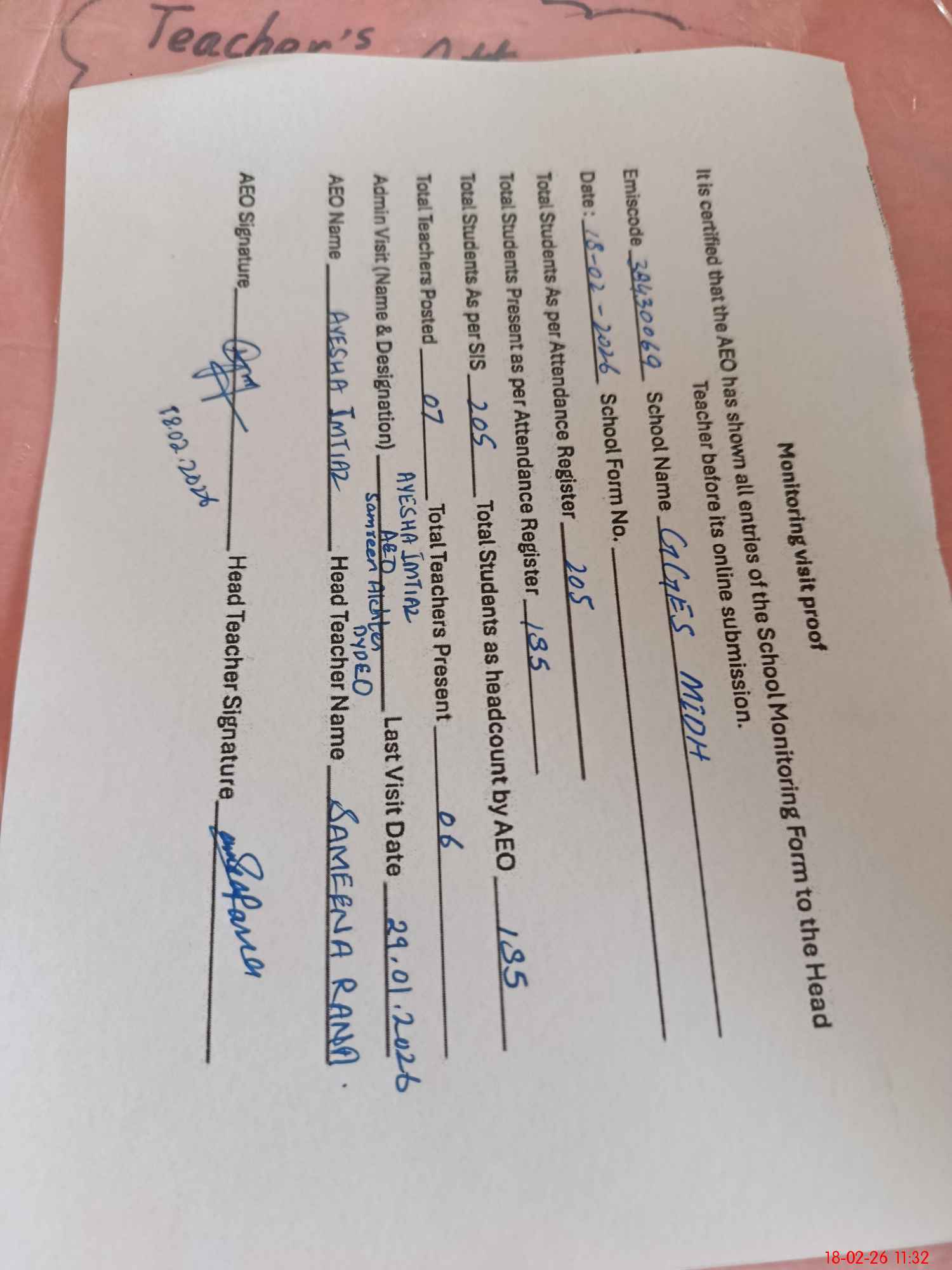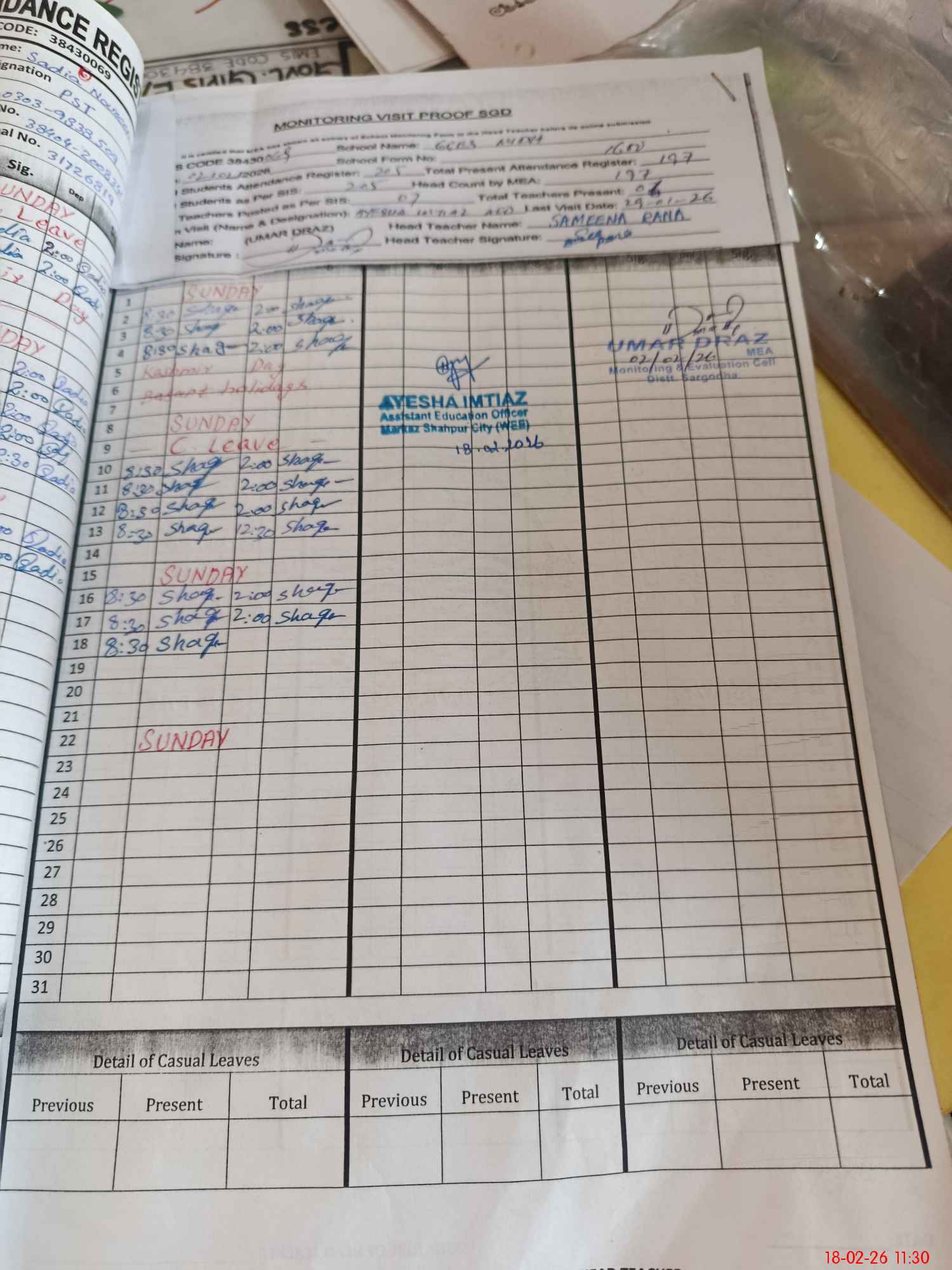 | Attendance Register | Head Teacher | MEA with School | Visit Proof |