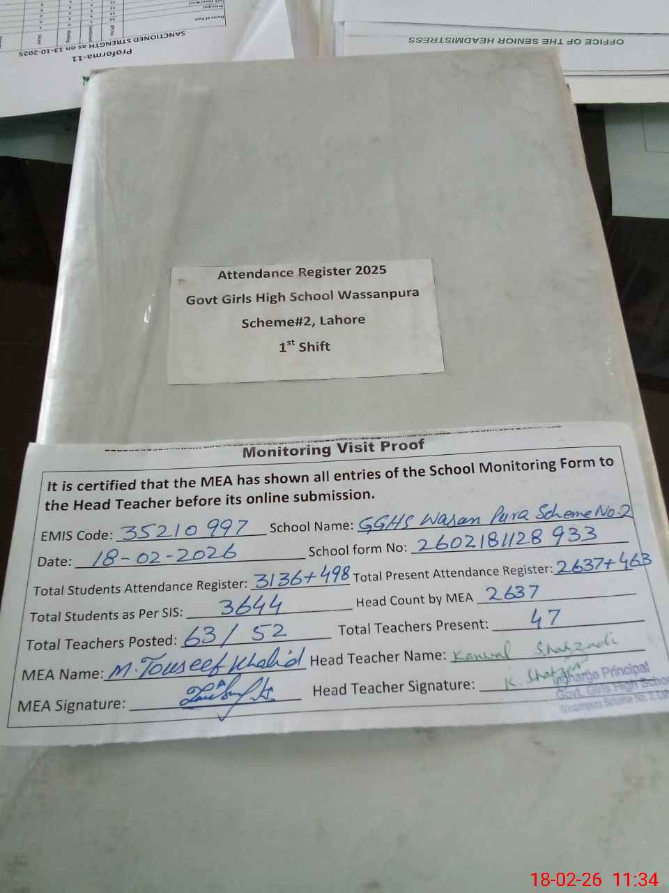 | Attendance Register | Head Teacher | MEA with School | Visit Proof |