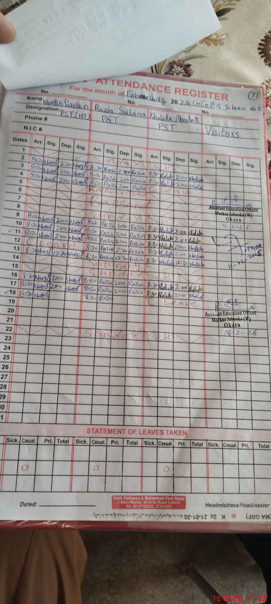 | District: OKARA | Tehsil: OKARA | Markaz: JABOOKA - FEMALE | Level: Primary | |