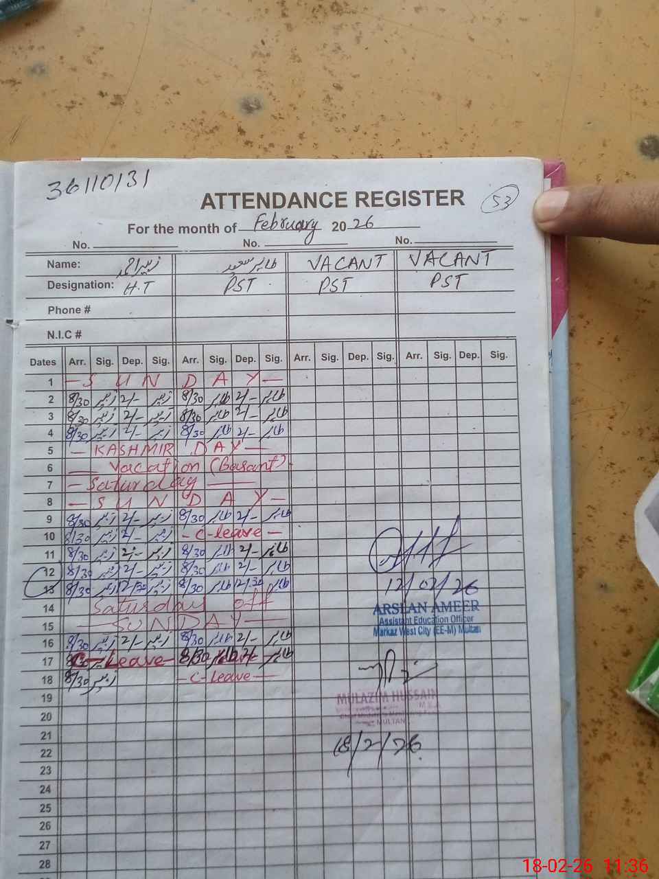 | CNIC | Full Name | Designation | R/C | Absence During Last Calender Month |