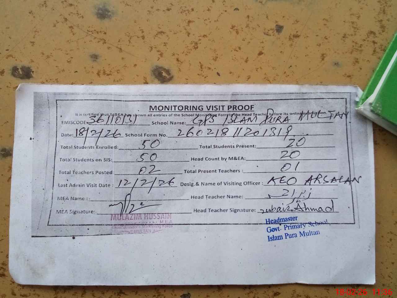 | Attendance Register | Head Teacher | MEA with School | Visit Proof |