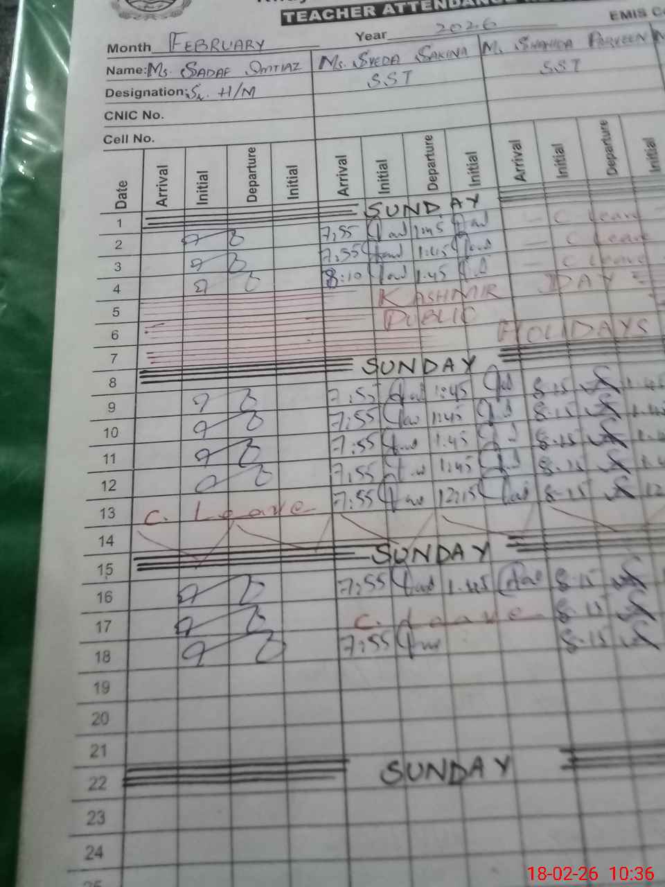 | CNIC | Full Name | Designation | R/C | Absence During Last Calender Month |