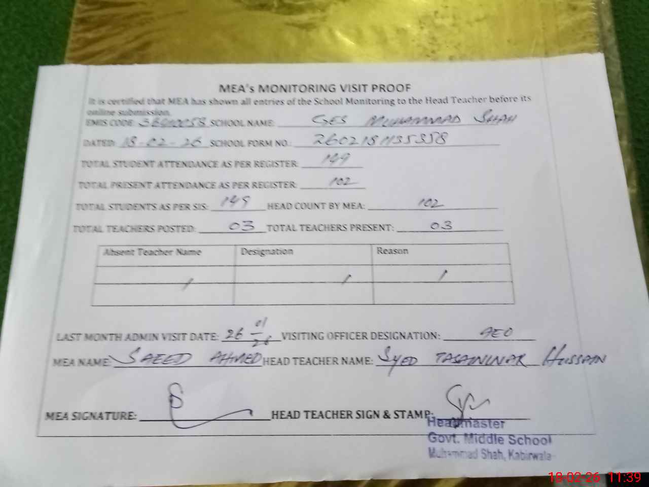 | Attendance Register | Head Teacher | MEA with School | Visit Proof |