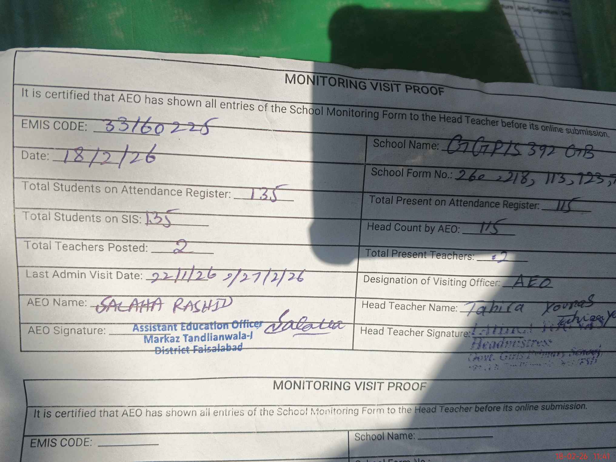 | EMIS Code: 33160225 | Name of School: GGPS CHAK 392 GB TANDLIANWALA | |||