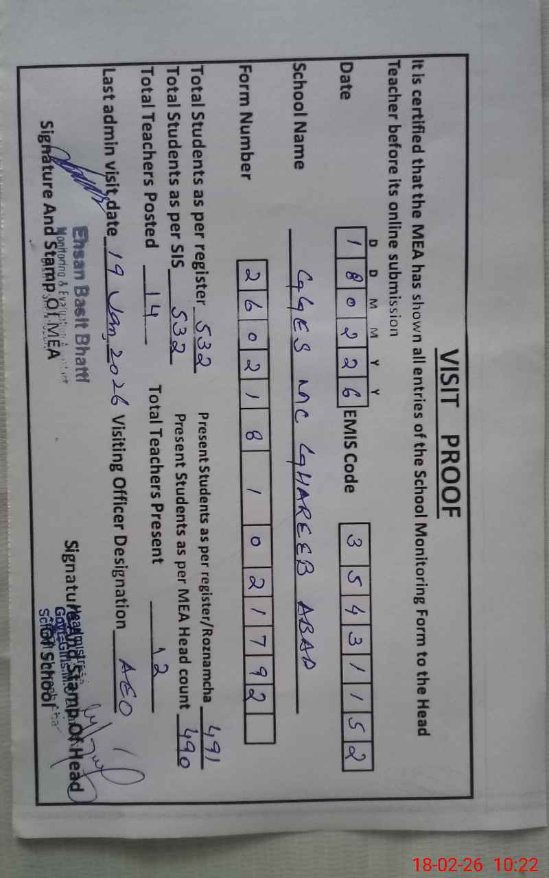 | Certified that this School was Inspected by the Undersigned MEA/DMO Today and the Information Stated Above is as Per Record. | |||||