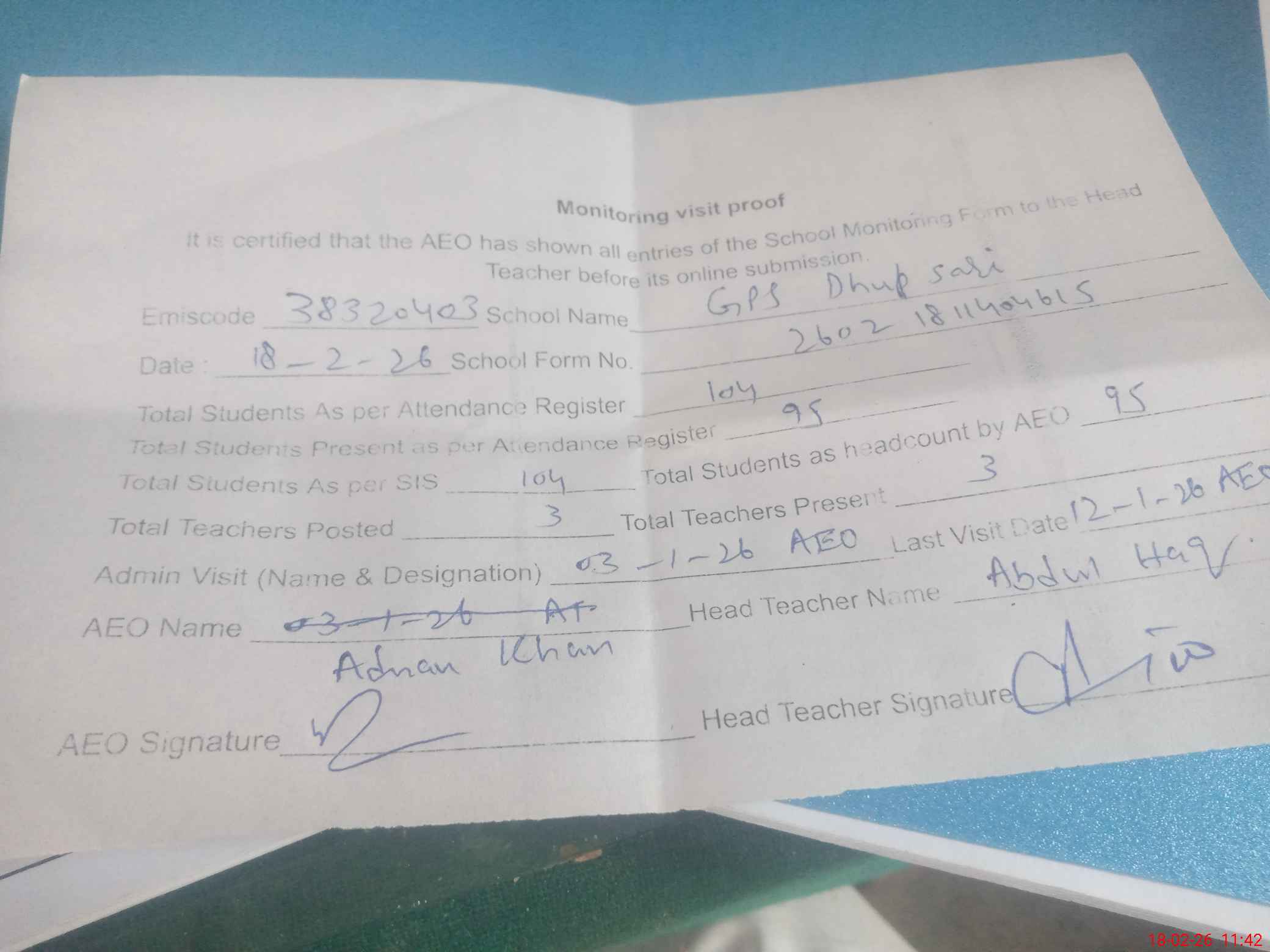 | Attendance Register | Head Teacher | MEA with School | Visit Proof |
