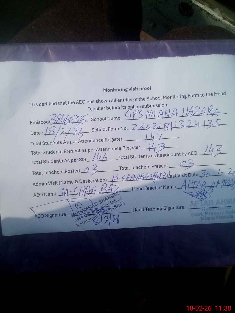 | EMIS Code: 38460285 | Name of School: GPS MIANA HAZARA | |||