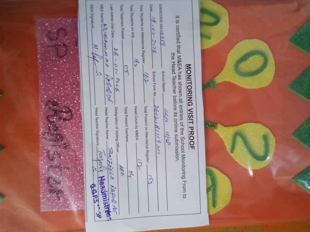 | Attendance Register | Head Teacher | MEA with School | Visit Proof |