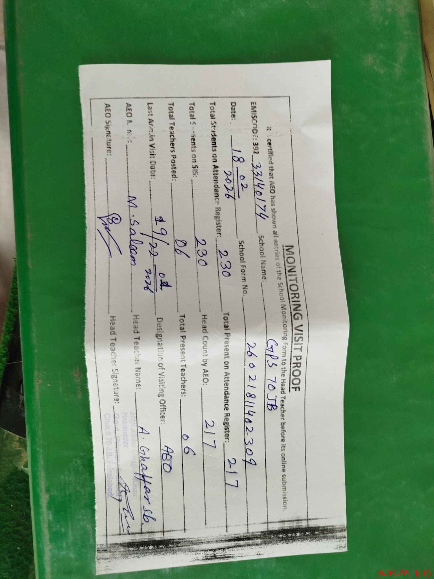 | Attendance Register | Head Teacher | MEA with School | Visit Proof |