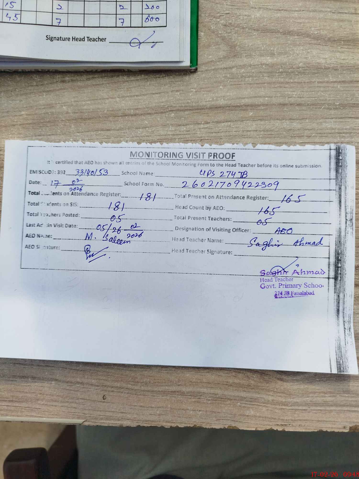 | Attendance Register | Head Teacher | MEA with School | Visit Proof |