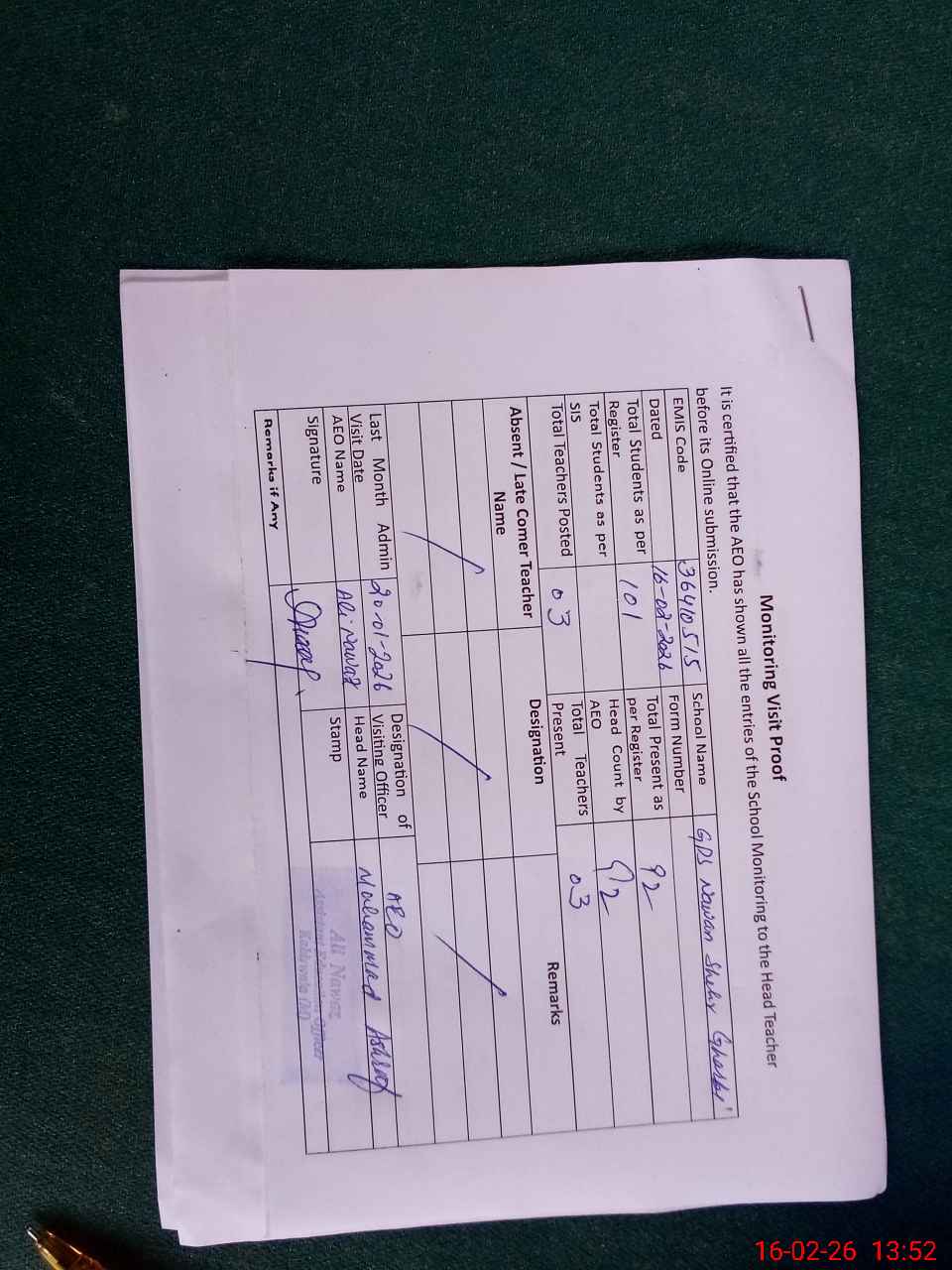 | Certified that this School was Inspected by the Undersigned MEA/DMO Today and the Information Stated Above is as Per Record. | |||||