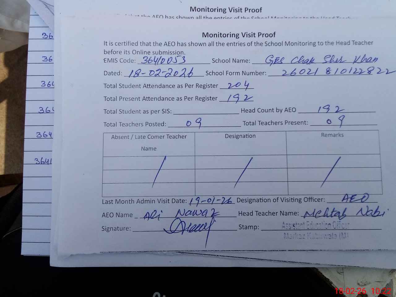 | Attendance Register | Head Teacher | MEA with School | Visit Proof |