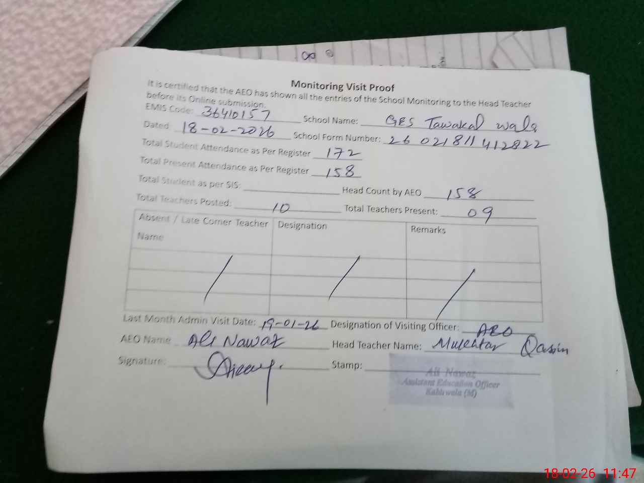 | Attendance Register | Head Teacher | MEA with School | Visit Proof |