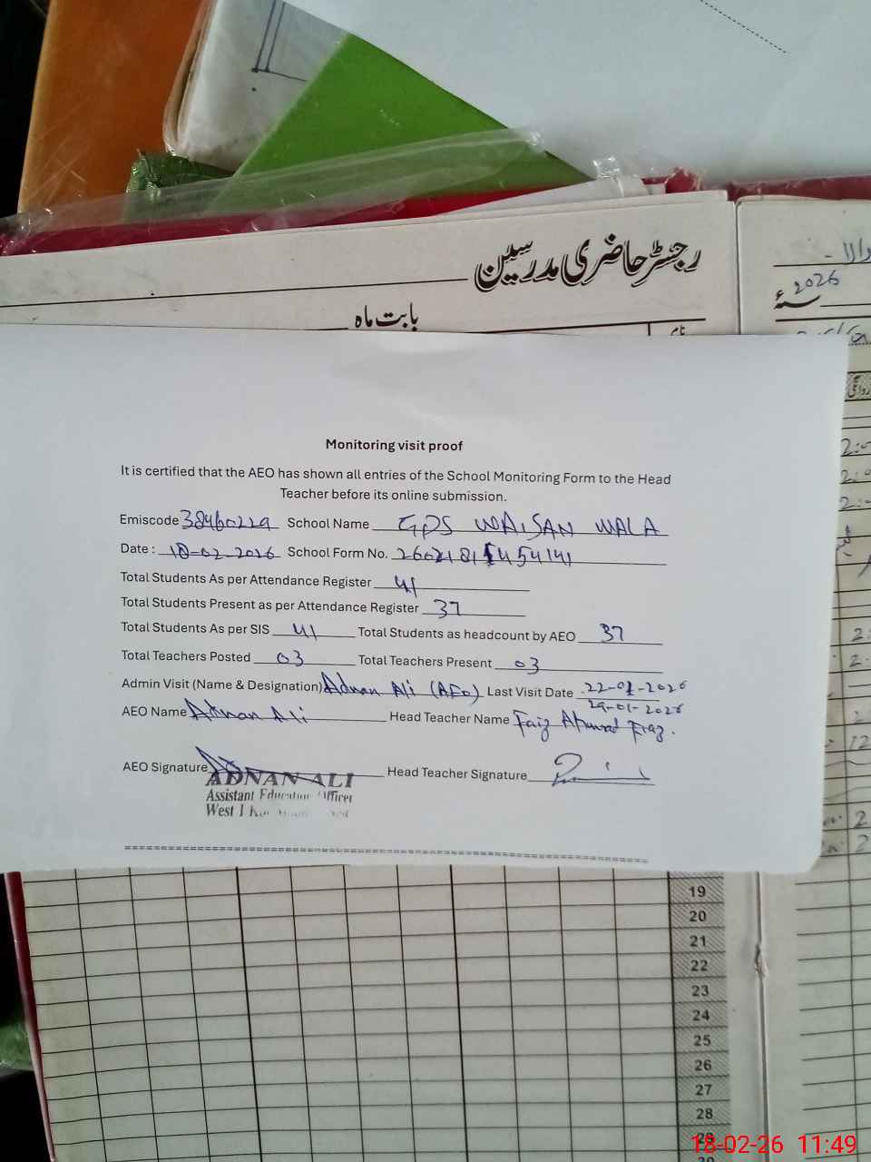 | Attendance Register | Head Teacher | MEA with School | Visit Proof |