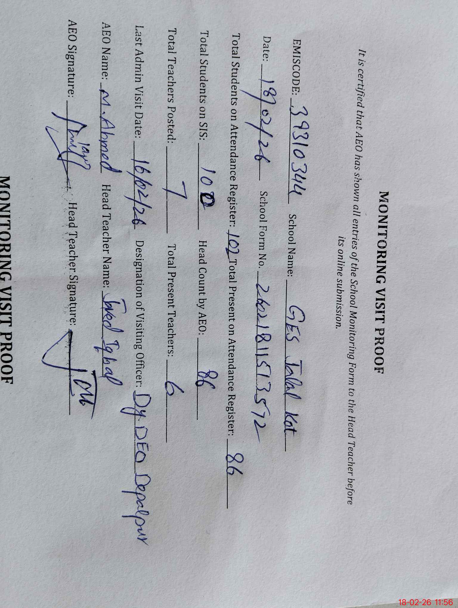 | EMIS Code: 39310344 | Name of School: GES JALAL KOT | |||