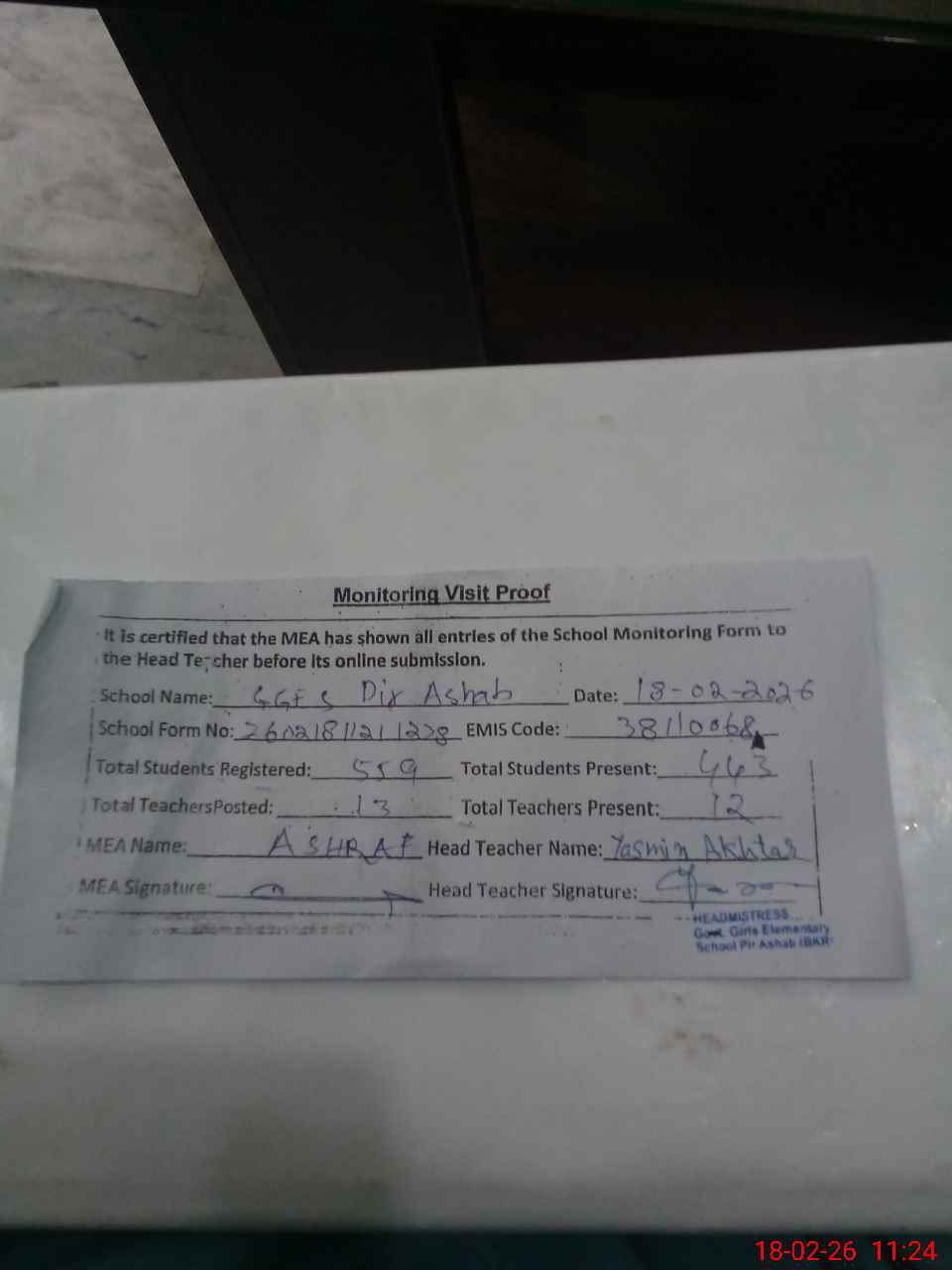 | Attendance Register | Head Teacher | MEA with School | Visit Proof |