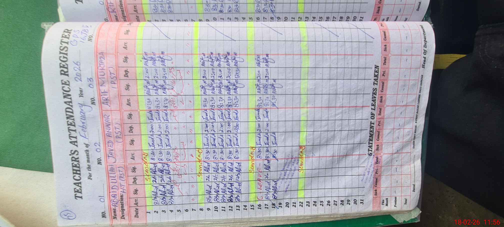 | CNIC | Full Name | Designation | R/C | Absence During Last Calender Month |