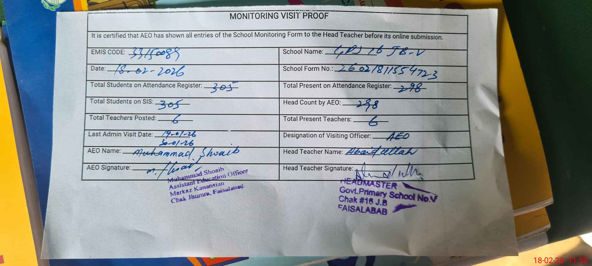 | Attendance Register | Head Teacher | MEA with School | Visit Proof |