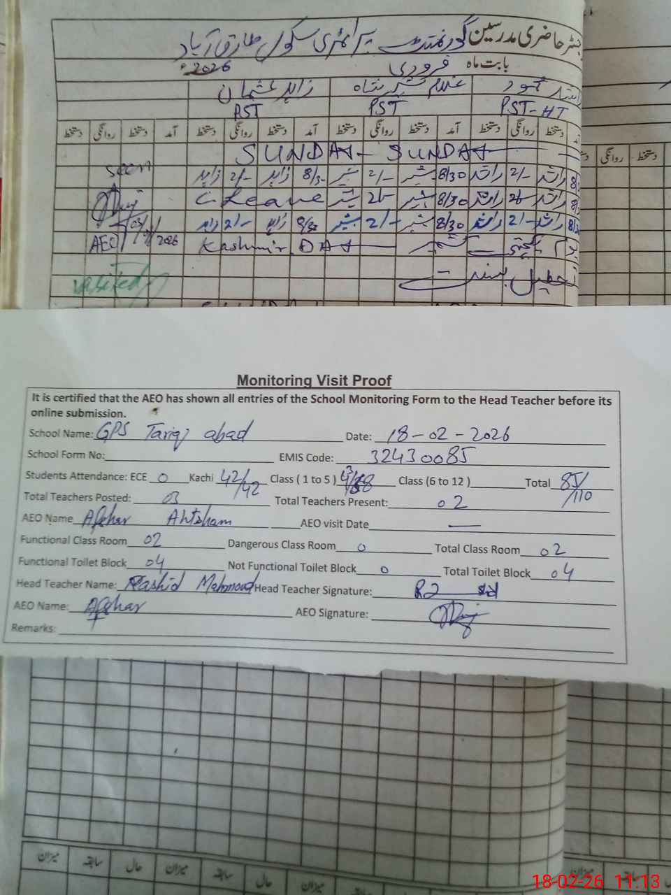 | Attendance Register | Head Teacher | MEA with School | Visit Proof |