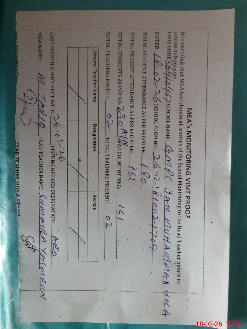 | Attendance Register | Head Teacher | MEA with School | Visit Proof |