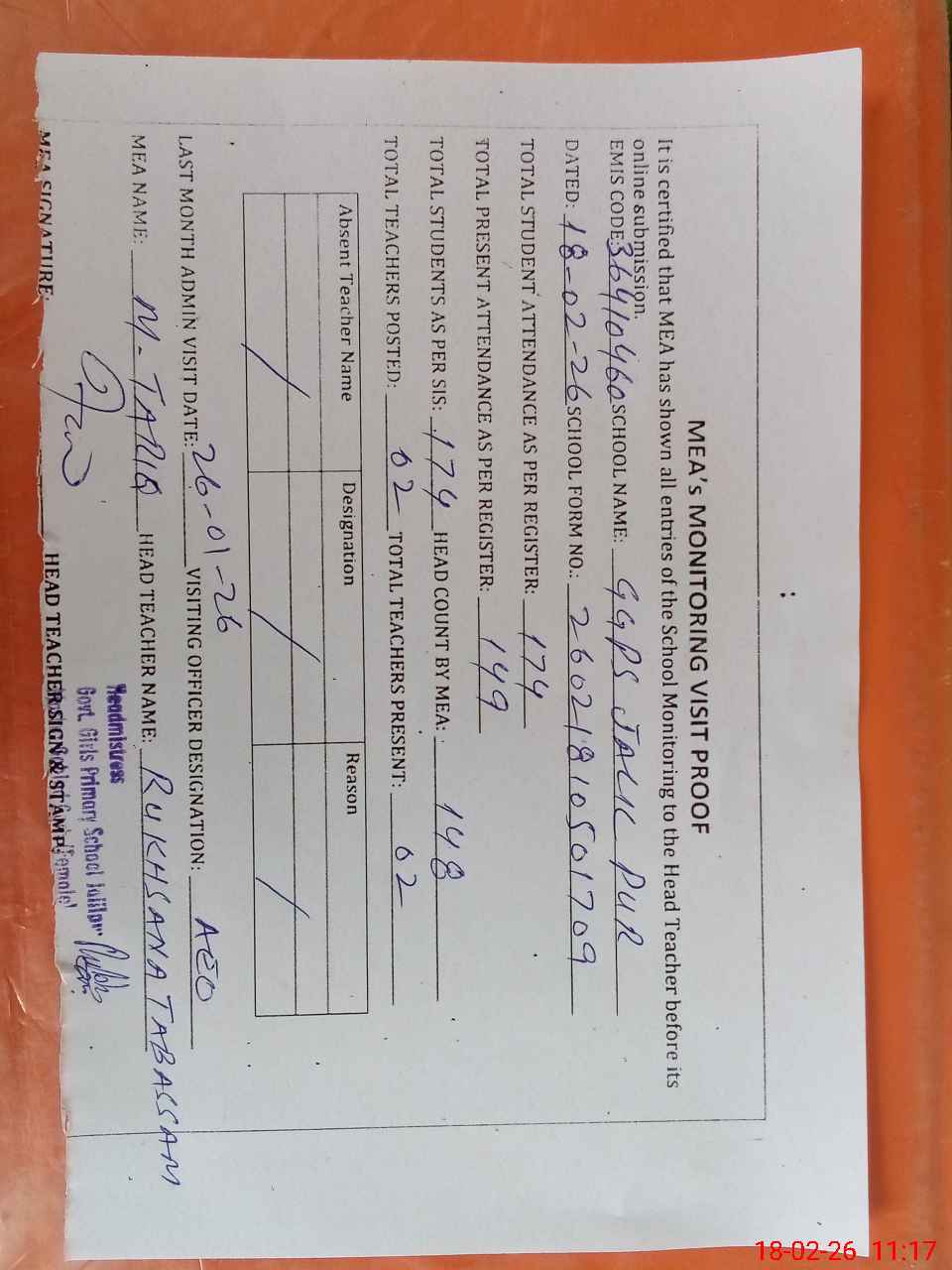 | EMIS Code: 36410460 | Name of School: GGPS JALIL PUR, ABDUL HAKIM | |||