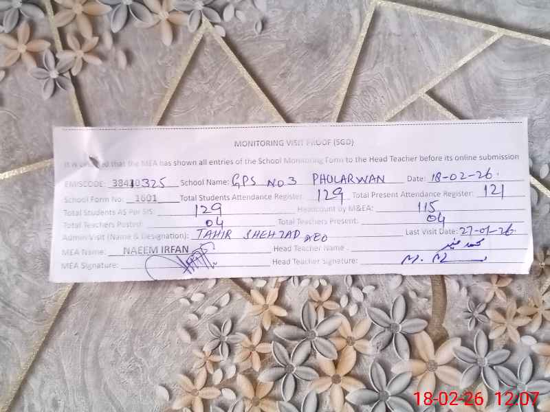| EMIS Code: 38410325 | Name of School: GPS NO. 3 PHULARWAN | |||
