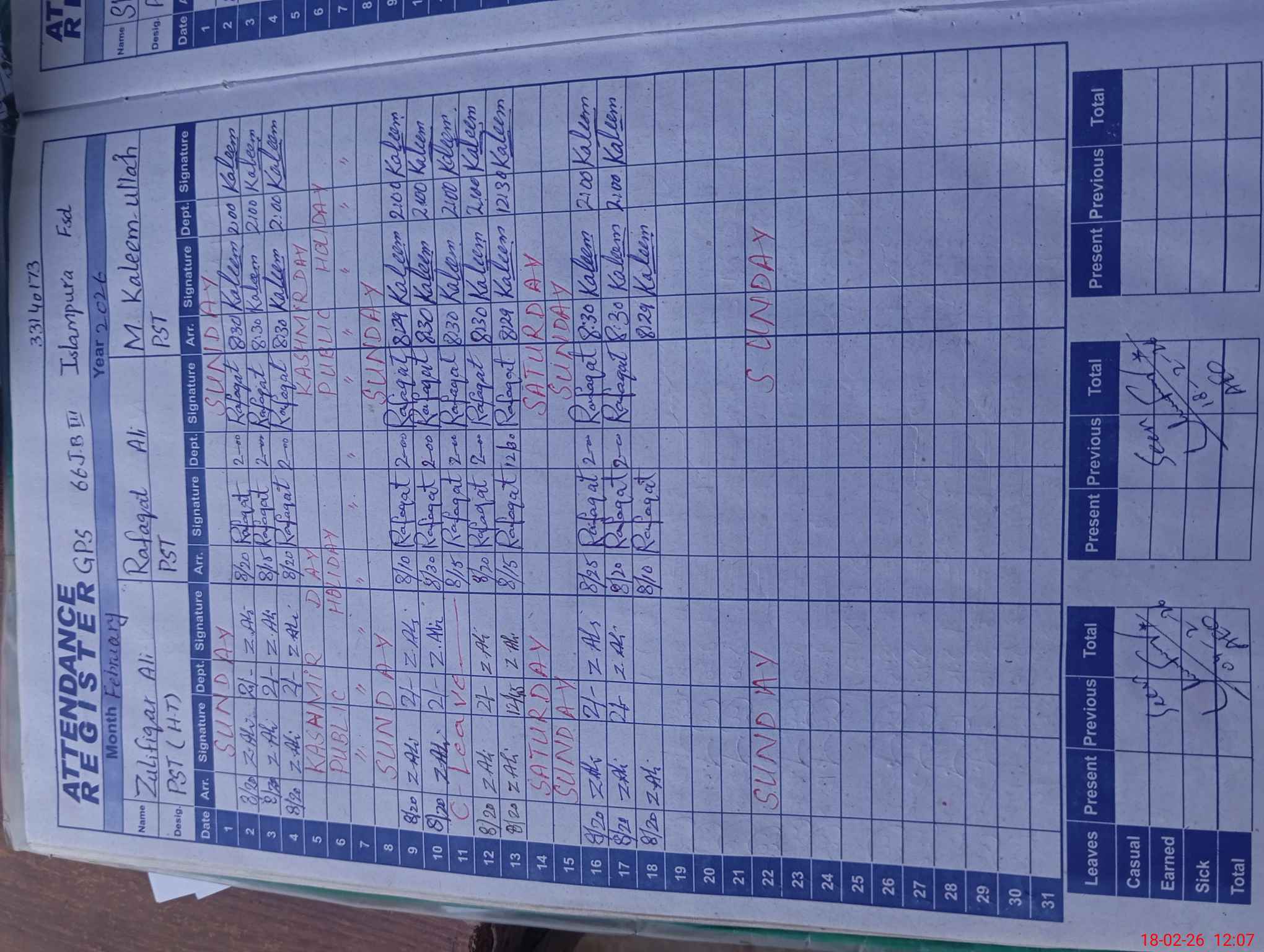 | CNIC | Full Name | Designation | R/C | Absence During Last Calender Month |