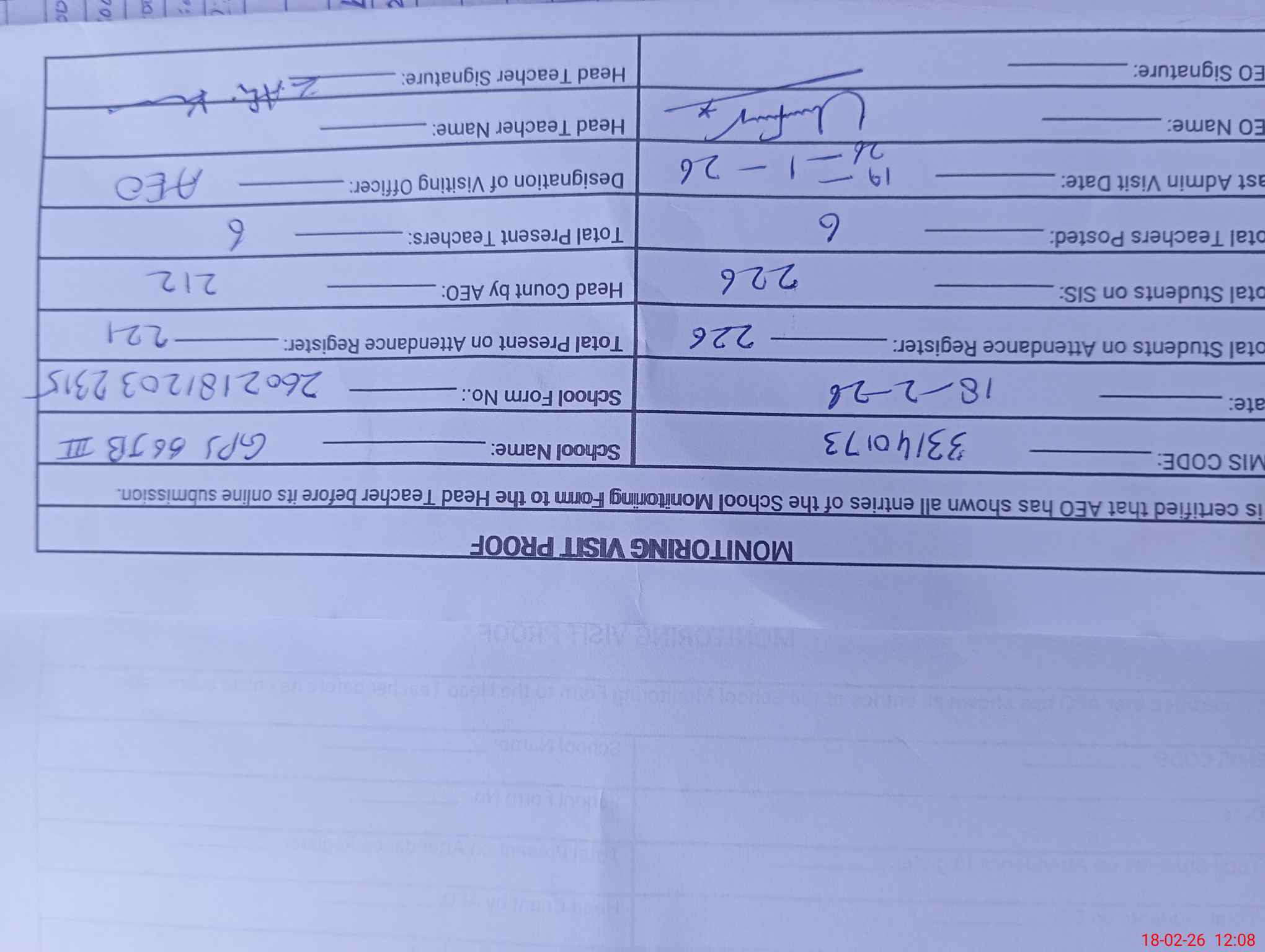 | Attendance Register | Head Teacher | MEA with School | Visit Proof |