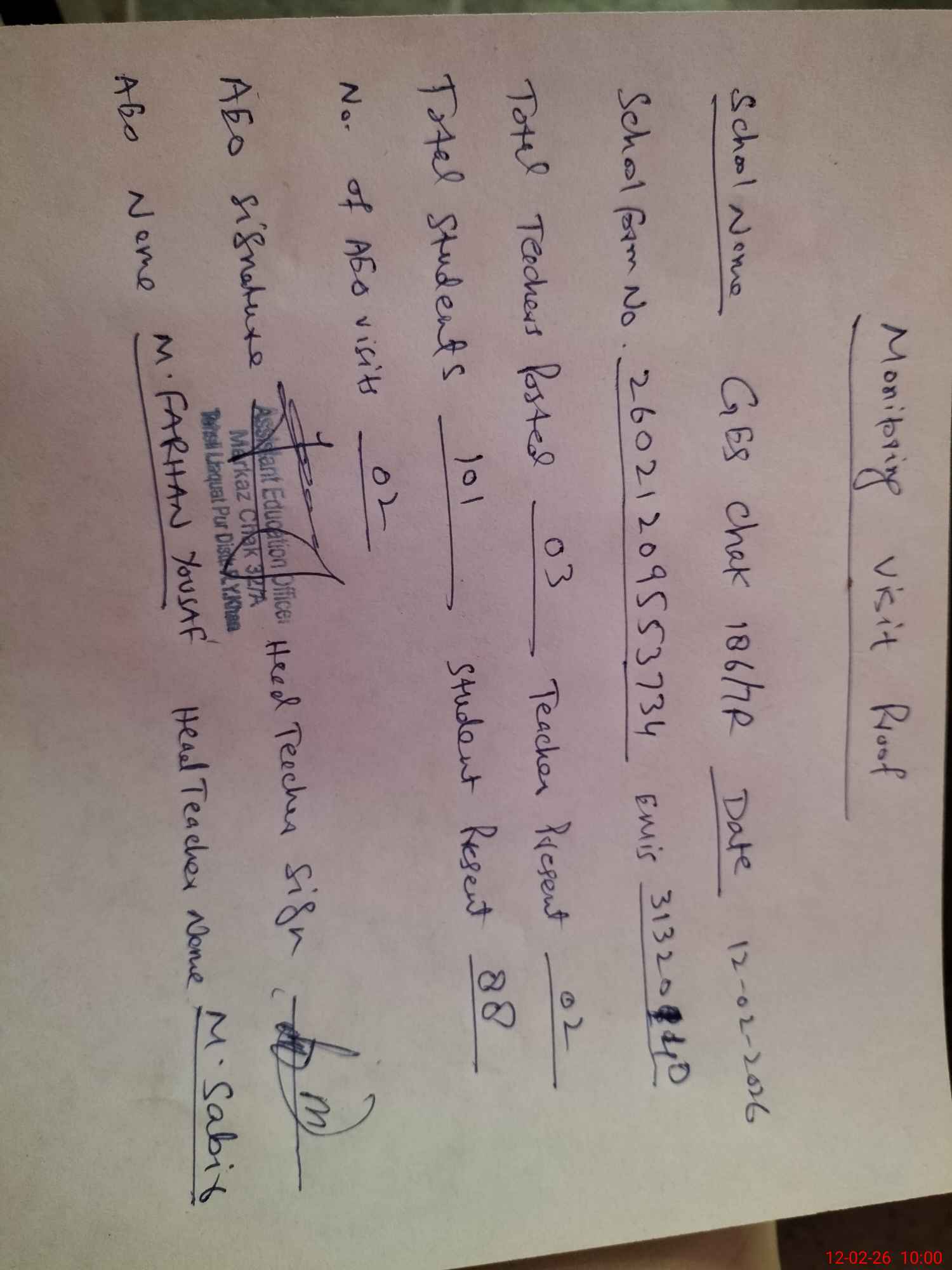 | Remarks (Use Separate Page if Required): School visit physically and all record checked and verified | |||||