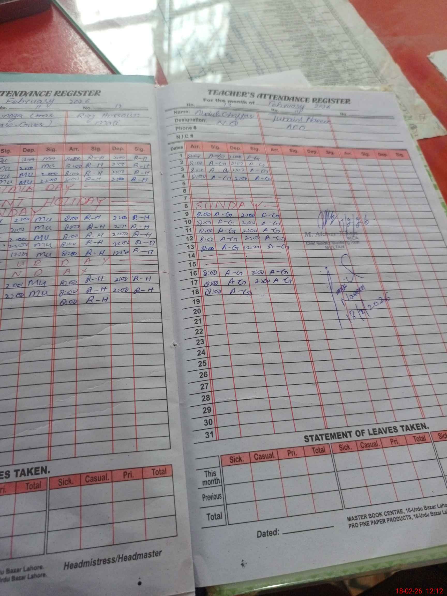 | Attendance Register | Head Teacher | MEA with School | Visit Proof |