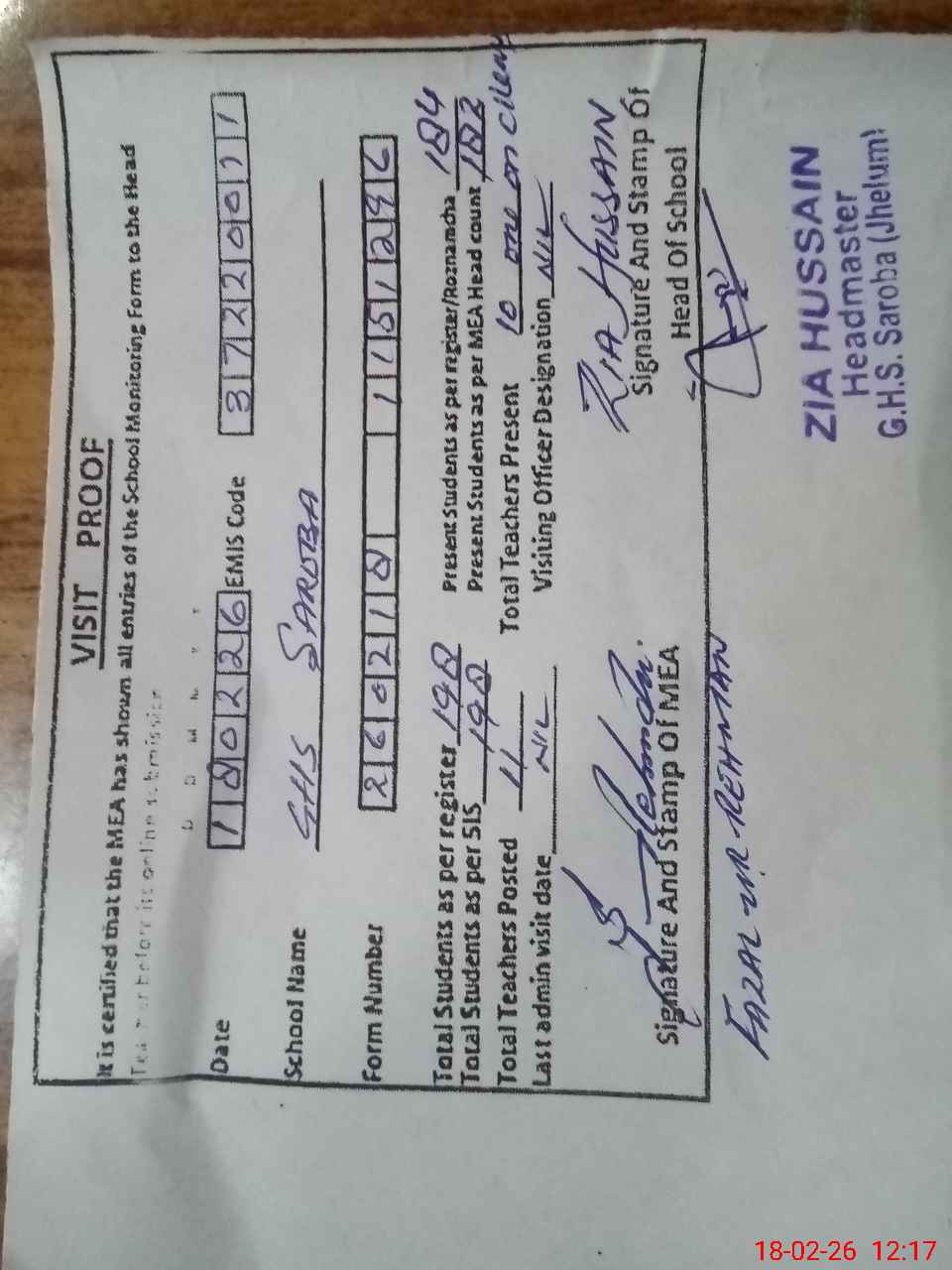 | Attendance Register | Head Teacher | MEA with School | Visit Proof |
