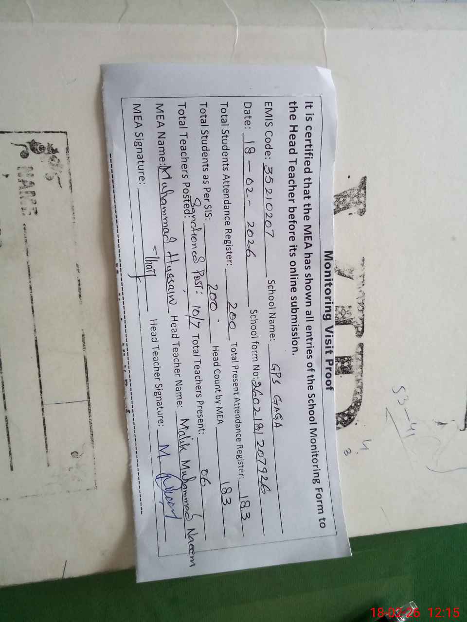 | Attendance Register | Head Teacher | MEA with School | Visit Proof |