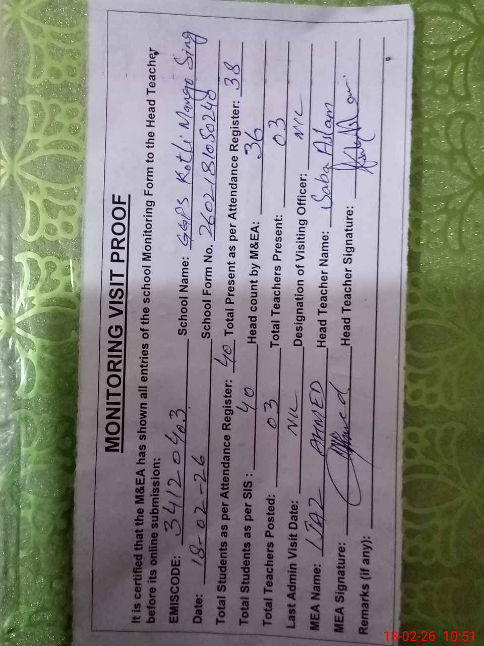 | Attendance Register | Head Teacher | MEA with School | Visit Proof |