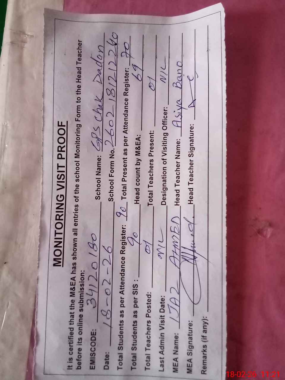| EMIS Code: 34120180 | Name of School: GPS CHAK DADAN | |||