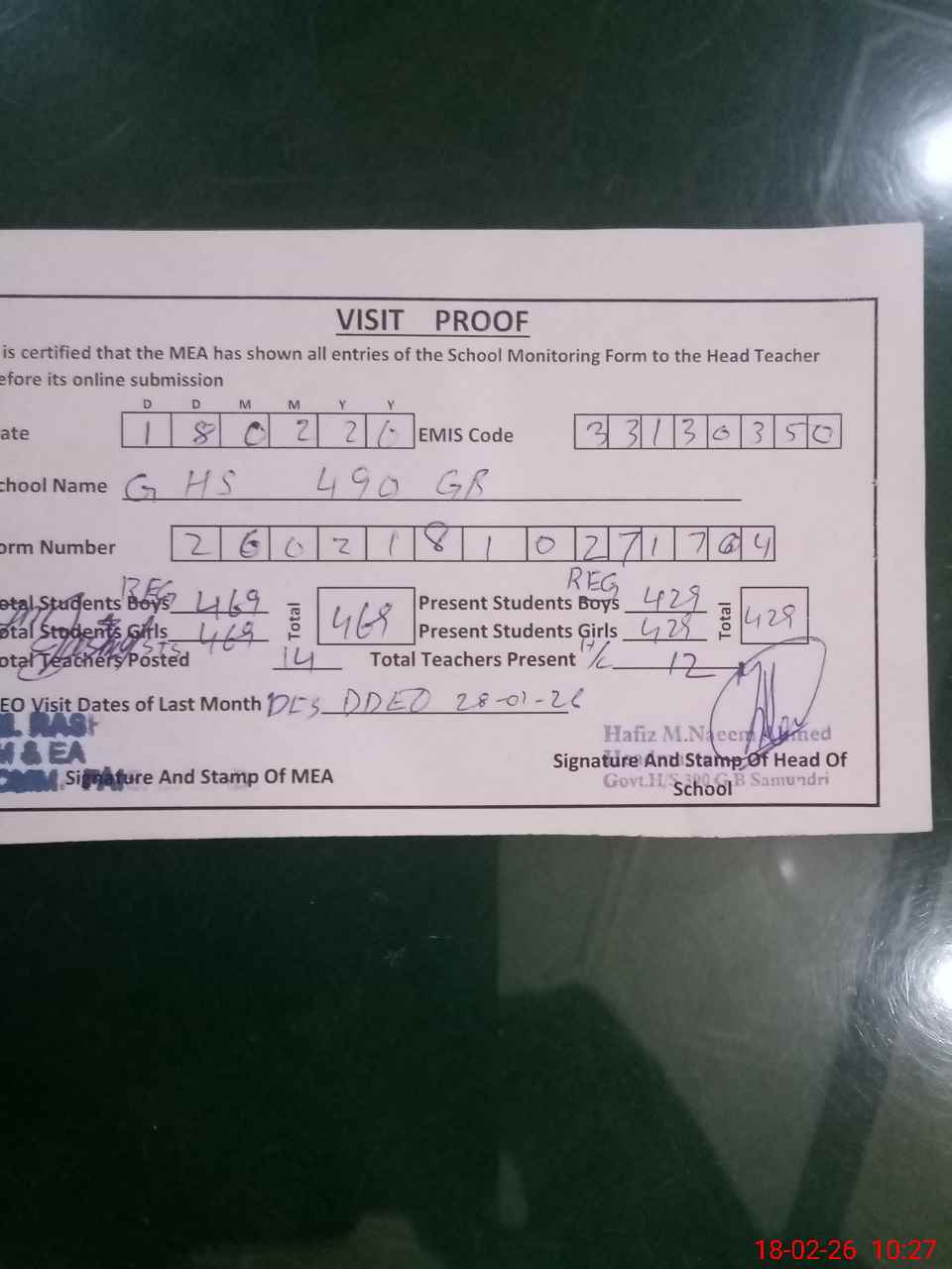 | Attendance Register | Head Teacher | MEA with School | Visit Proof |